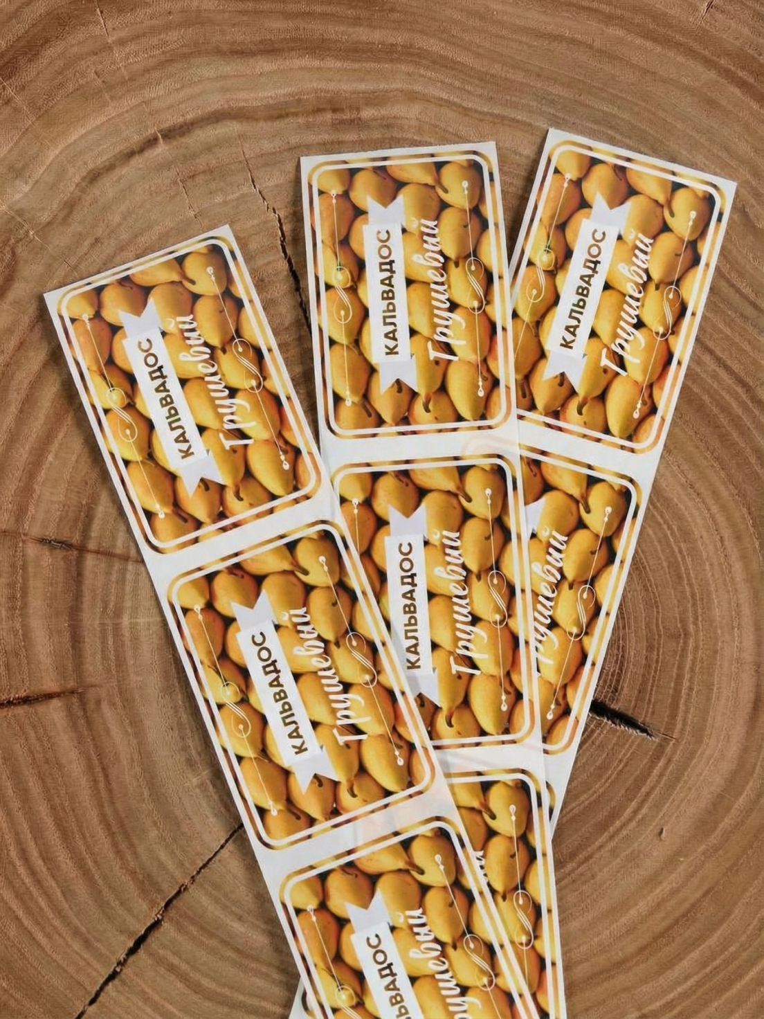 Наклейки выполнены из качественного металлизированного материала с премиальным блеском, который эффектно смотрится на стекле. Дизайн с надписью «Кальвадос грушевый» подчеркнёт характер содержимого и добавит бутылке индивидуальности. Удобный формат позволяет легко наклеить и, при необходимости, снять этикетку, чтобы использовать повторно — идеально, если вы экспериментируете с рецептами или дарите напиток в своей таре.