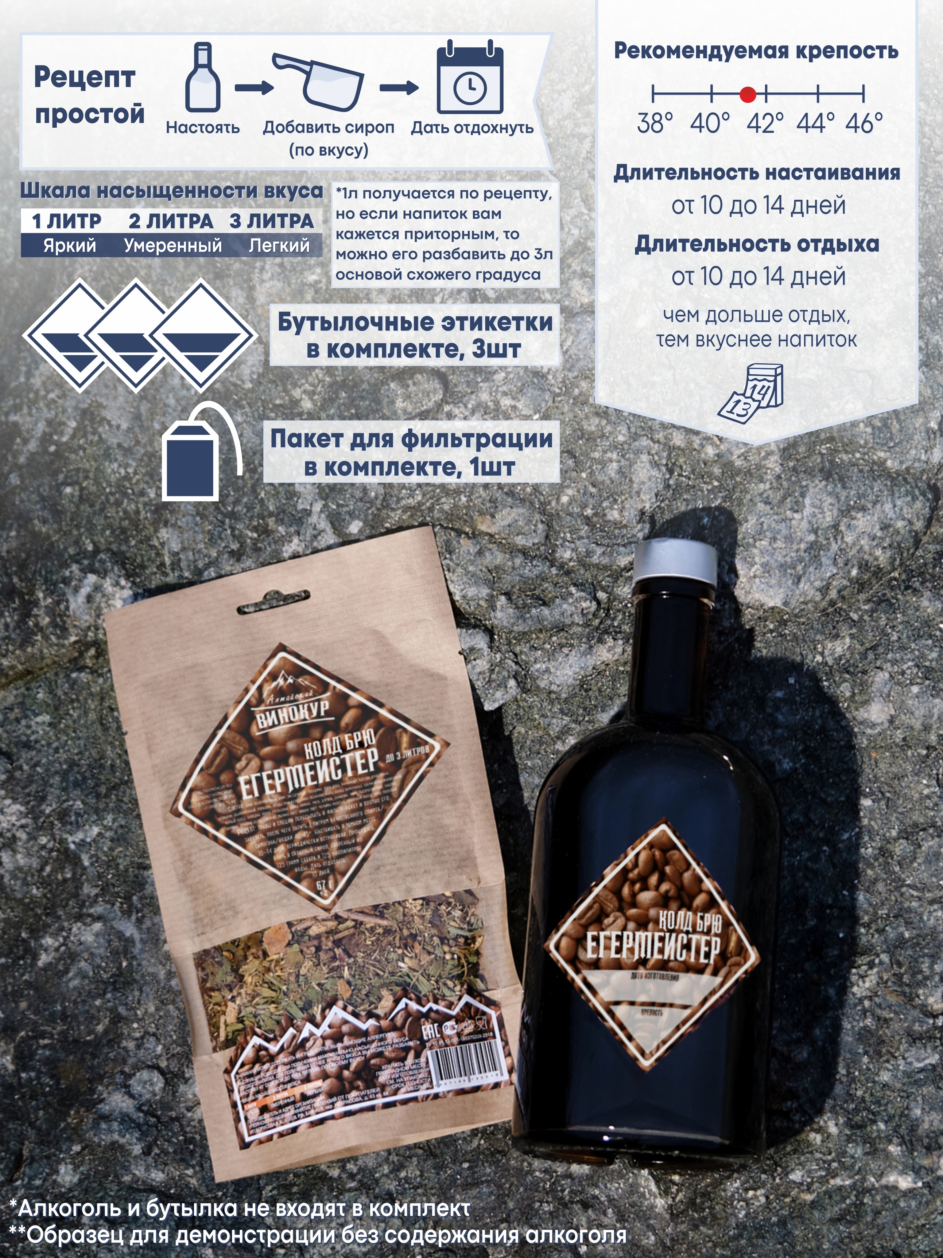 Представьте: мощь и сложность легендарного травяного биттера, встретившиеся с бархатной глубиной и прохладной гладкостью качественного cold brew кофе. "Алтайский Винокур" представляет революционную новинку — набор для приготовления настойки «Егермейстер Колд Брю»! Это не просто добавка кофе — это гармоничный симбиоз, где холодная кофейная изысканность становится неотъемлемой частью знакомой многогранности.