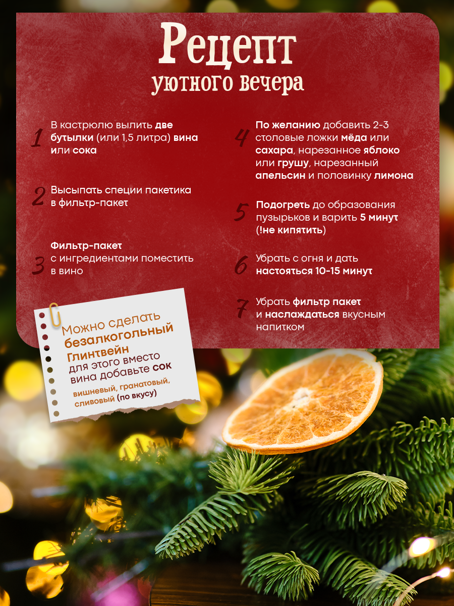 Создайте идеальную атмосферу уюта с нашим подарочным набором для приготовления глинтвейна! Этот ароматный согревающий напиток станет главным украшением ваших зимних вечеров и праздничных застолий. Всего 15 минут — и вы получите настоящий шедевр с насыщенным вкусом и незабываемым ароматом.